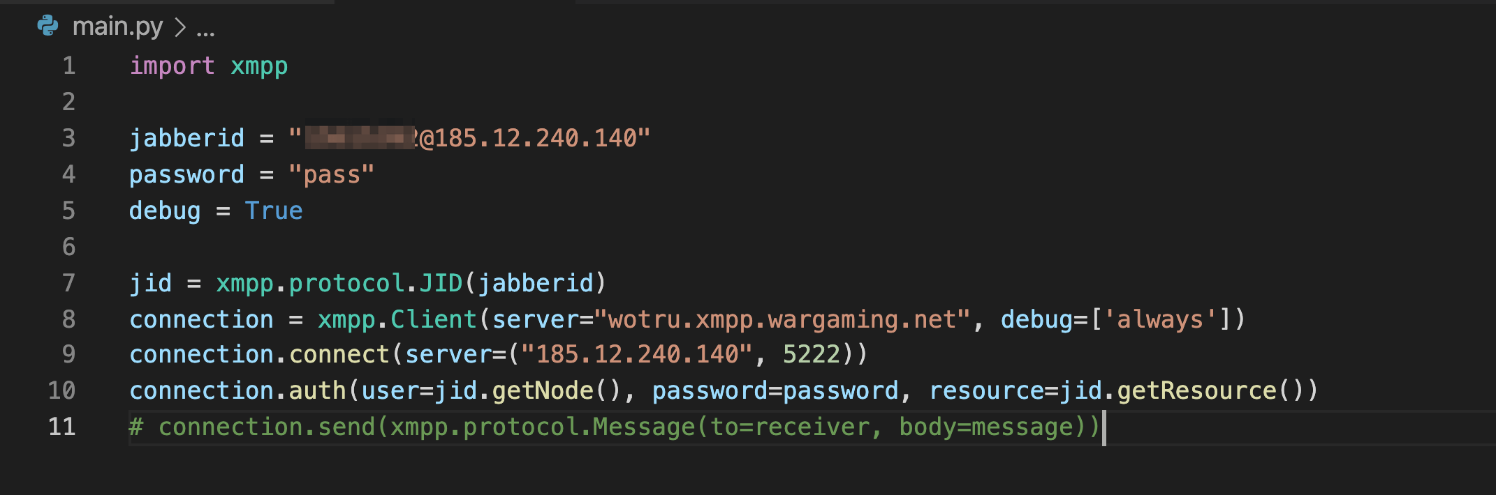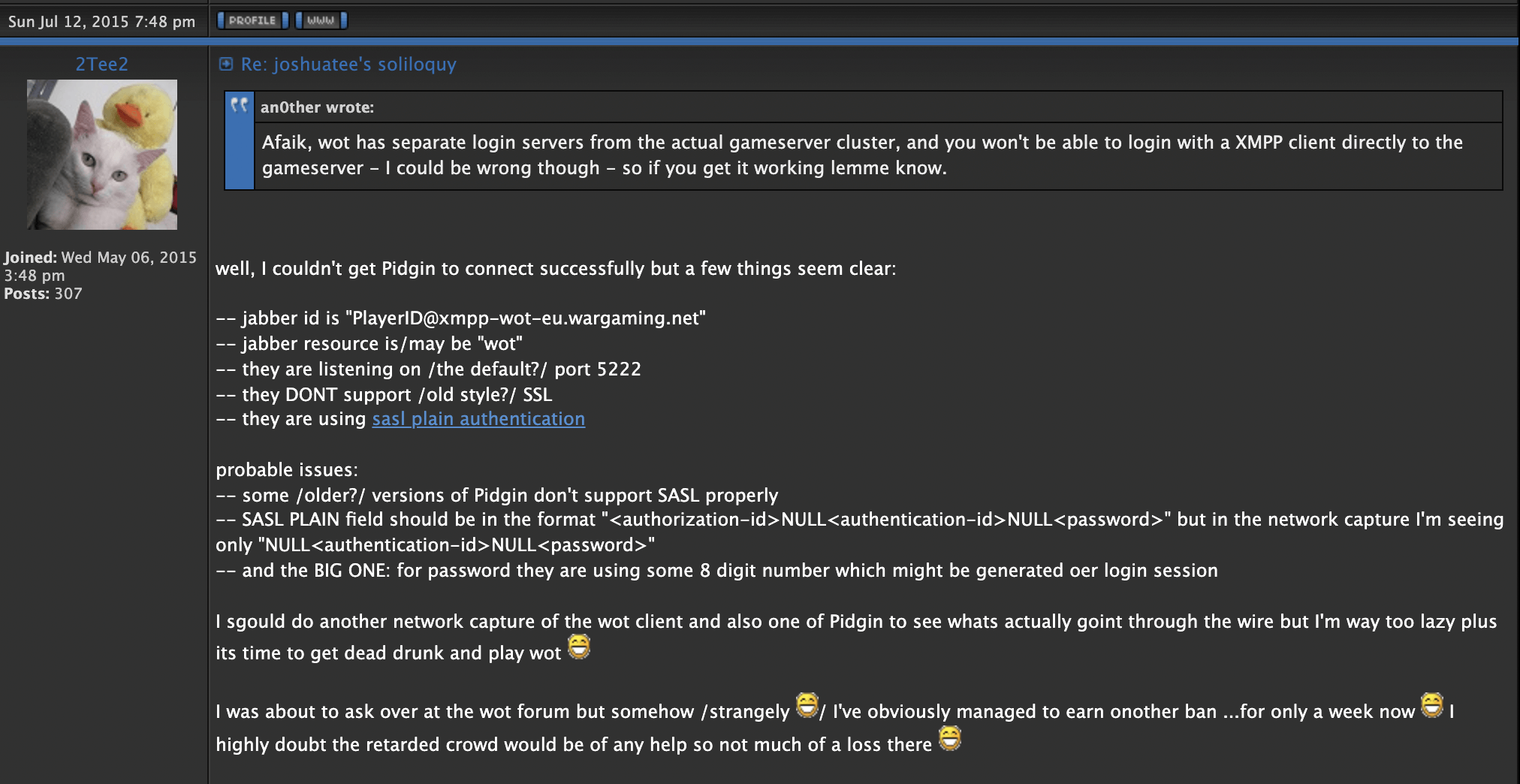 Я прогуглил “wot xmpp” и все что смог найти - это обсуждение на форуме где кто-то пытался, как и я, зареверсить танковый чат и баг репорт в github либы Mixaill/galaxy-integration-wargaming