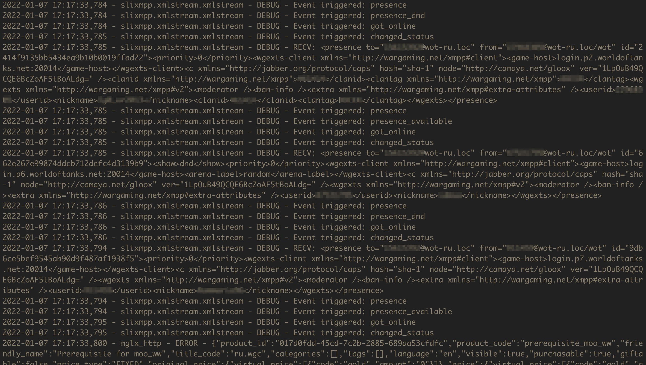 Я вспомнил, что уже видел упоминание xmpp протокола в исходниках клиента. И тут все сложилось для меня в единую картину понимания! Танковый чат работает на основе xmpp протокола! И похоже все события от сервера тоже приходят по этому протоколу.
